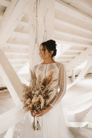 Auttie is our go-to dress if you are looking for some elegant drama. She has volumised sheer lace sleeves that leave everyone feeling like the princess in their own story. She has a cheeky yet subtle slit within the skirt which gives you the chance to show off your shoes. One of our most recent brides got married in the breathtaking Valley of Fire desert and used the slit to show off her indie cowboy boots, click here to see her bohemian wedding.